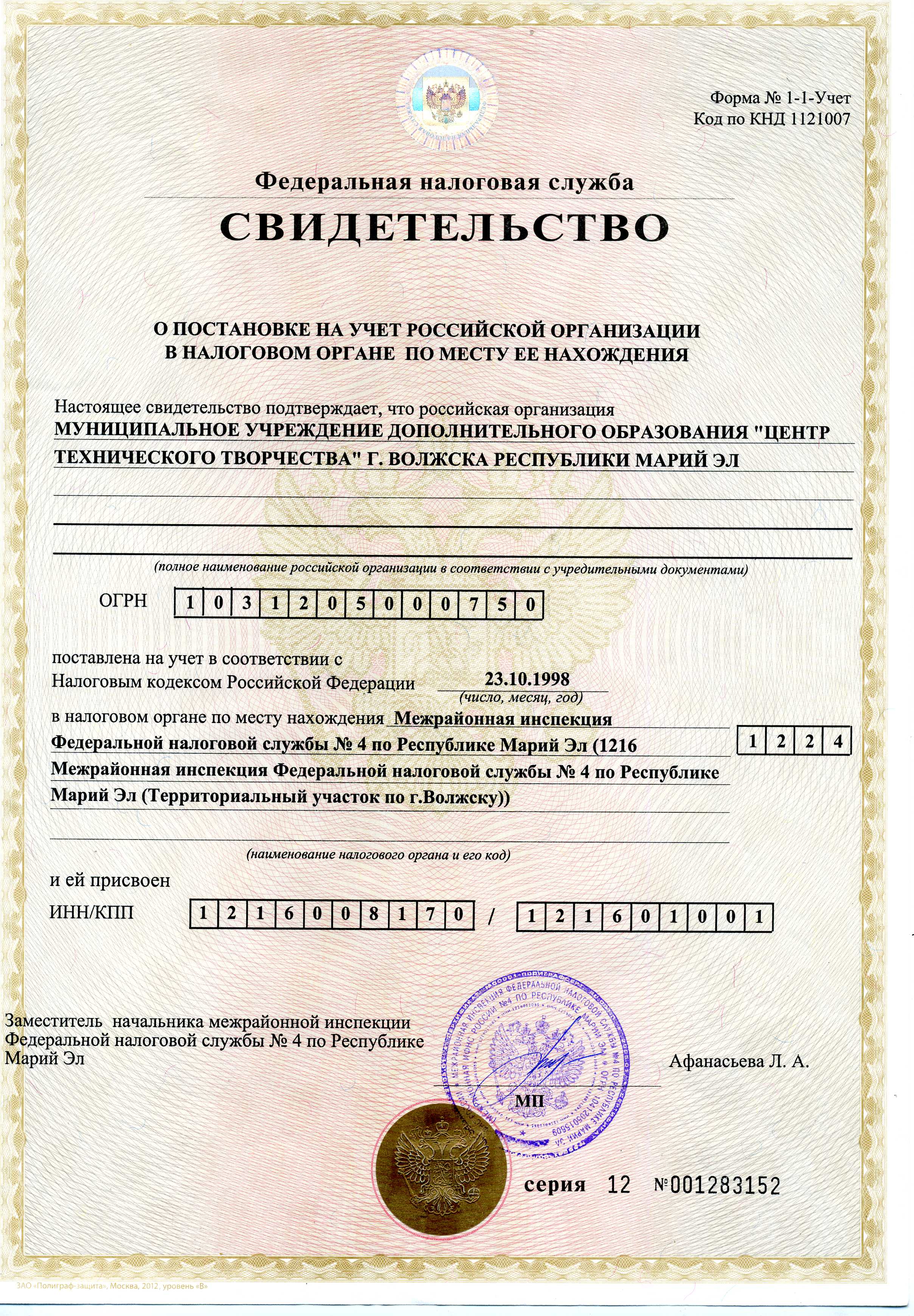 - Место регистрации Устава Межрайонная ИФНС России № 4 по Республике Марий Эл в Единый государственный реестр юридических лиц внесена запись 24 апреля 2007 г.