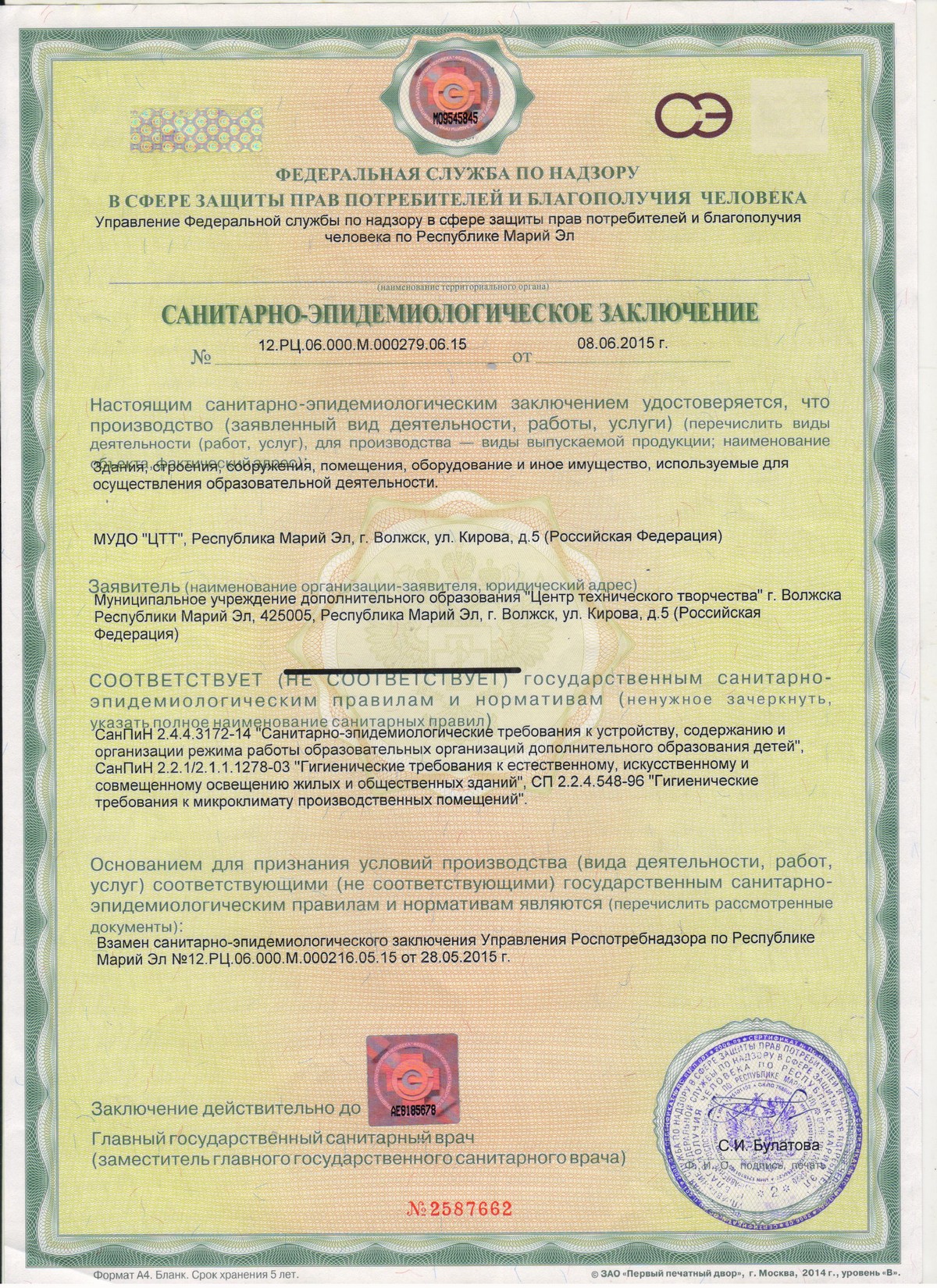 - Санитарно-эпидемологическое заключение от 08.06.2015