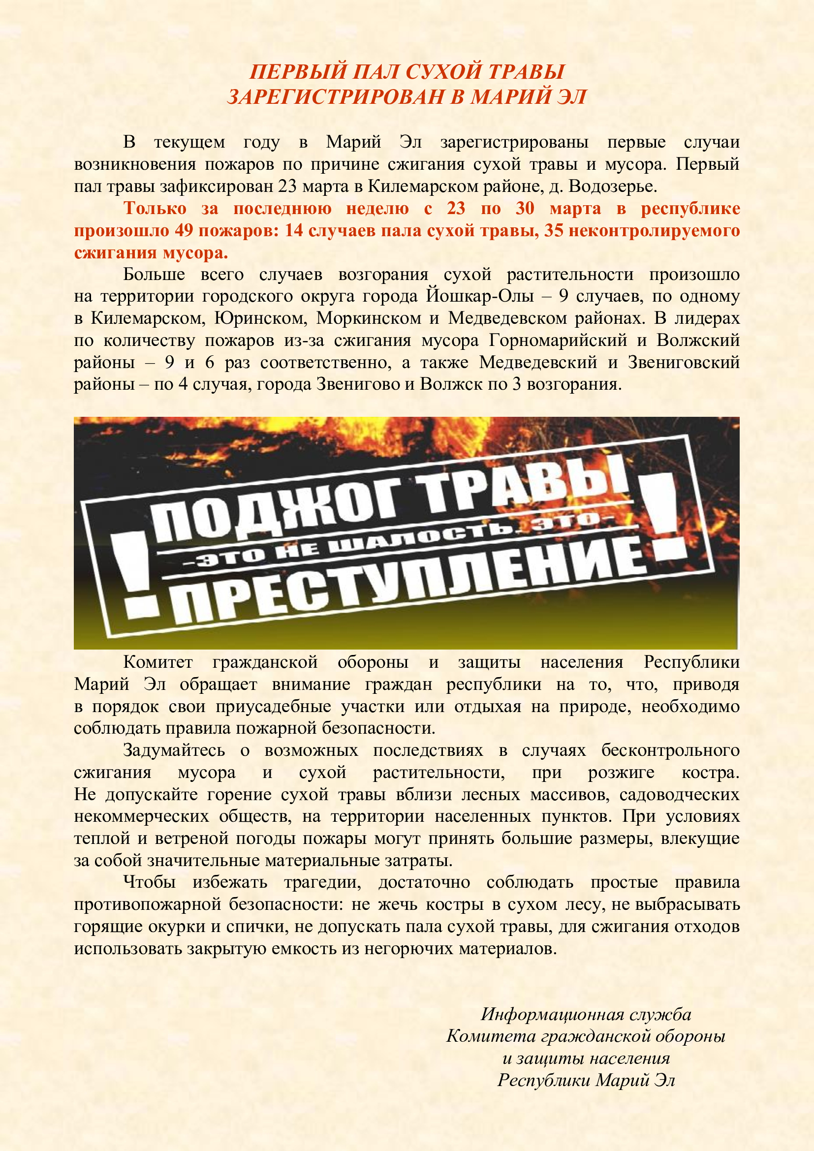 - Памятка на тему "Первый пал сухой травы зарегистрирован в Марий Эл "
