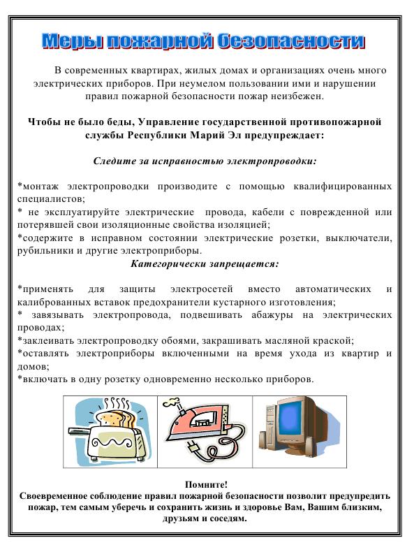 - Памятки по пожарной безопасности: